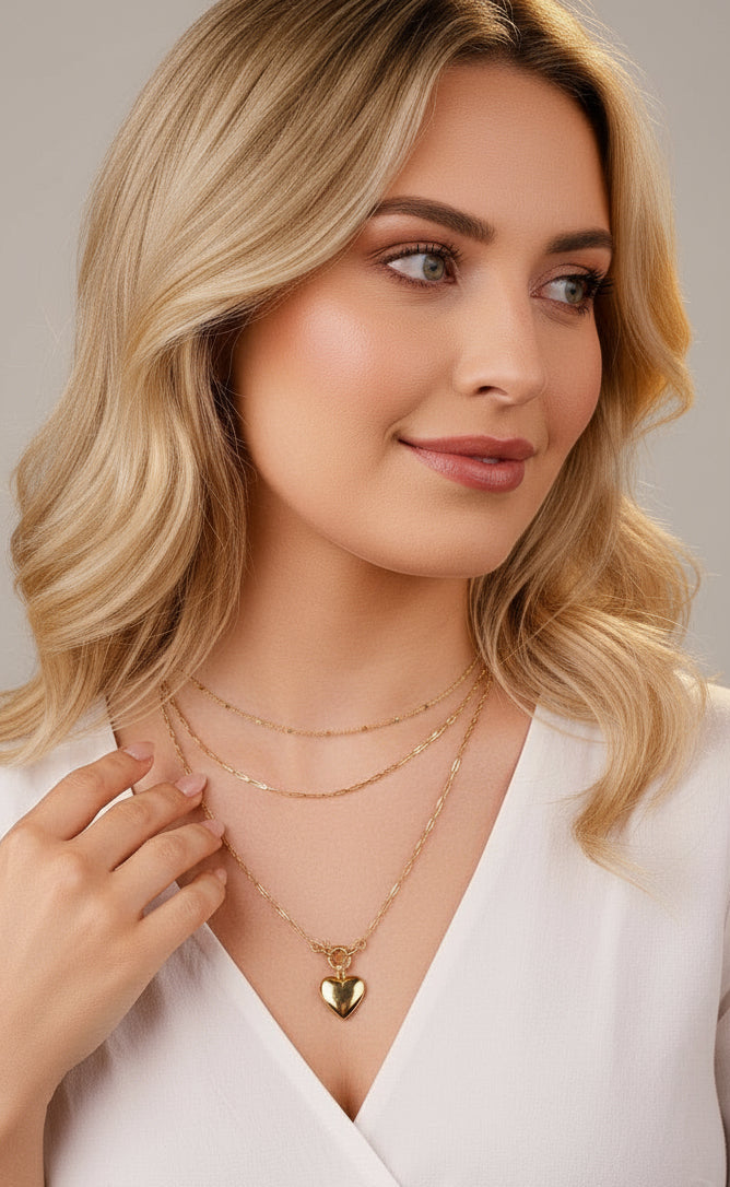- O colar elos com fecho boia dourado com medalha pingente de coração, é muito versátil e pode ser usado de três maneiras: com o fecho para a parte de trás, com o fecho para a frente com pingentes e com o fecho para frente sem pingentes.